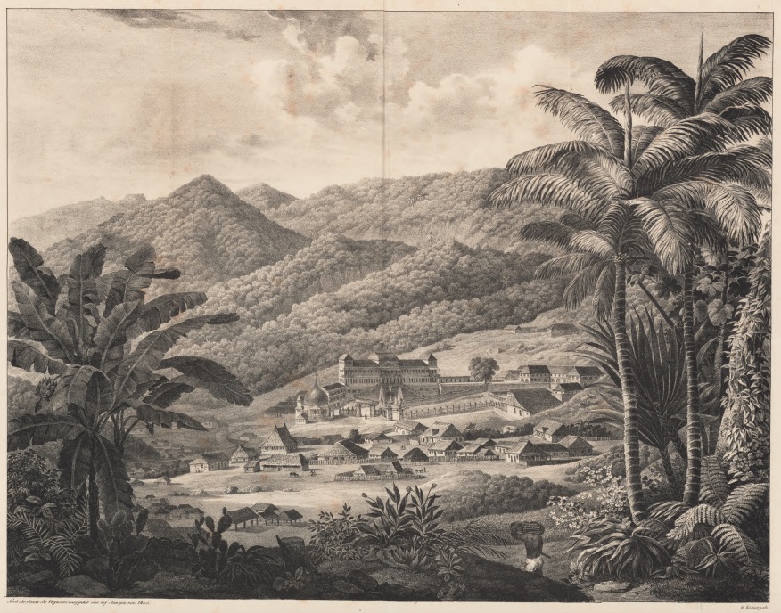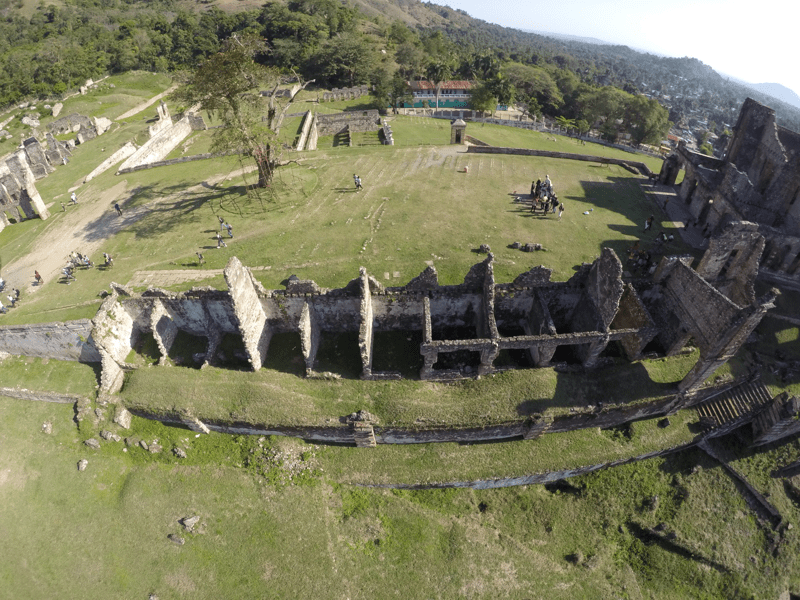 Situated at the base of the Bonnet à l’Eveque mountain, Sans-Souci represents the crowning achievement of Henry Christophe’s reign as King of the Kingdom of Hayti. Spanning 13 hectares, the expansive complex includes the royal residence, a queen’s residence, stables, barracks, gardens, prisons, an arsenal, several maintenance workshops, a hospital, and administrative buildings such as the mint, the Great State Council, the library, etc. The official entry consists of two porticoes formed by four monumental pillars, flanked to the east by the royal chapel, a circular building coiffed by a slate covered dome. The palace itself housed banquet and reception rooms, the monarch’s workroom, the private apartments of the king and queen and their daughters, and the quarters of the domestics and staff of the royal family. Sans-Souci was thus described as a veritable Versailles in the Caribbean because of its splendor. Oft-cited traditions claim the palace was built rapidly between 1811 and 1813, early in the reign of Christophe as King. However, historical sources indicate Christophe was building on the site as early as 1804, and Habitation Milot was a major sugar plantation in the 18th Century, suggesting a deeper construction and occupation history on the site.
