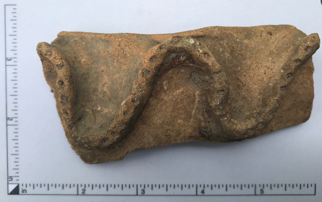 In 2017 the Milot Archaeological Project initiated excavations in the Palais de la Reine, designated Area B. Excavations on the east side of the structure identified a small section of the Royal Era building’s interior, the piers of an exterior arcade, an exterior brick threshold, and carriage tracks extending outwards in the courtyard facing the structure. Additionally, these excavations revealed the remains of a clay tile and mortar floor that extended across both the arcade and the building’s interior, as well as out onto a patio to the east.